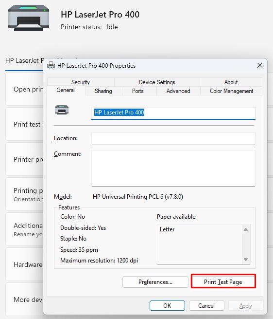 3. Chọn Print Test Page